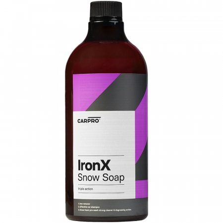 Уникальная pH-сбалансированная формула шампуня позволяет легко очистить органические загрязнения, образовавшиеся на поверхности вашего автомобиля в ходе естественной эксплуатации. Обладает эталонными лубрицирующими свойствами, содержит специальные ПАВы и эмульгаторы, которые позволяют эффективно и деликатно очищать не органические загрязнения в виде металлических вкраплений и пыли, дорожных загрязнений, солевых отложений, образовавшихся на лакокрасочных поверхностях кузова автомобиля и колесных дисков. В зависимости от выбранной концентрации IronX Snow Soap можно использовать для удаления металлической пыли с кузова автомобиля при помощи пенокомплекта, либо по методу двух ведер, а так же для глубокой очистки колесных дисков и резины. Состав также применяется для удаления ранее нанесенных защитных полимеров и восков.