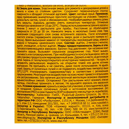 Специальная акриловая эмаль для покраски элементов салона автомобиля из натуральной и искусственной кожи, различных виниловых и пластиковых материалов. Отличается высокой эластичностью, не отслаивается и не растрескивается. Наносится на предварительно обезжиренную и очищенную поверхность без грунта. Степень блеска: матовый. Расход: 200 мл. – 1 м2 Высыхание от пыли: 5-10 мин.. Высыхание на ощупь: 10-20 мин. Полное высыхание: 120 мин. Минимальная рабочая температура: 10 °C. Максимальная рабочая температура: 25 °C.